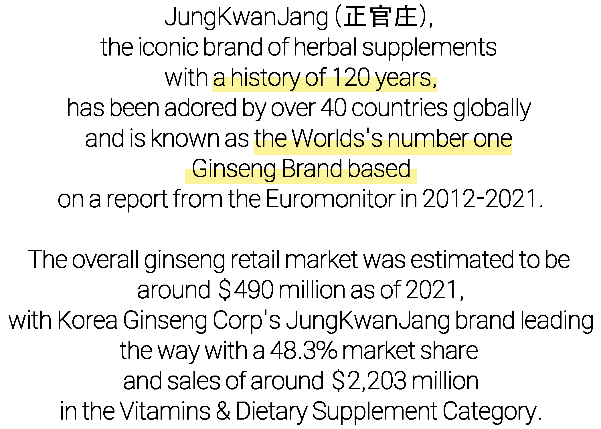 Renowned worldwide, Korea Ginseng Corporation (KGC), with its subsidiary lines JungKwanJang, Koreselect, GoodBASE, and Donginbi, is the number one brand of ginseng with over 120 years of horticultural and scientific expertise.